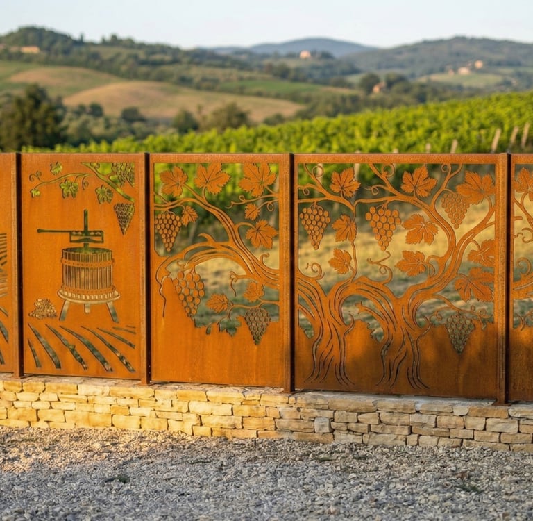 Corten ograja ne pomeni le ravne plošče postavljene v vrsto. Sodobne tehnologije laserskega rezanja omogočajo izjemno natančne in kompleksne vzorce — od geometrijskih oblik do organskih motivov dreves, listov ali abstraktnih kompozicij. Oblikujemo lahko tudi lamele iz cortena. Možnosti so praktično neomejene.