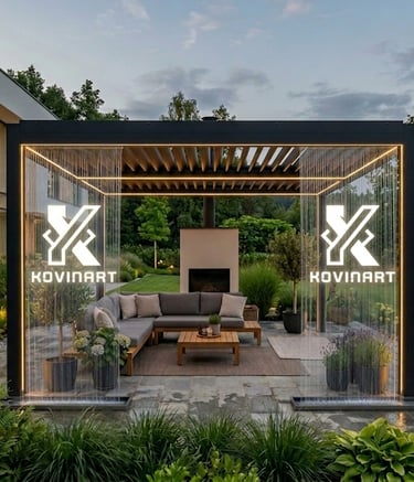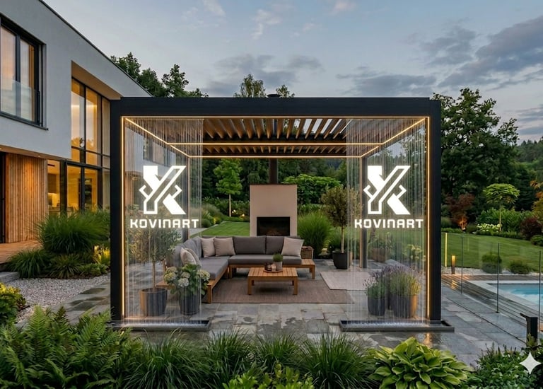 Montiramo pergole z inovativnimi rešitvami. Tako imate pri nas na voljo pergole s številnim zvočnimi in svetlobnimi efekti, posebna novost pa je pergola z vodno zaveso, ki lahko prikazuje tudi logotip vašega podjetja, primerno za hotele in razna letovišča.